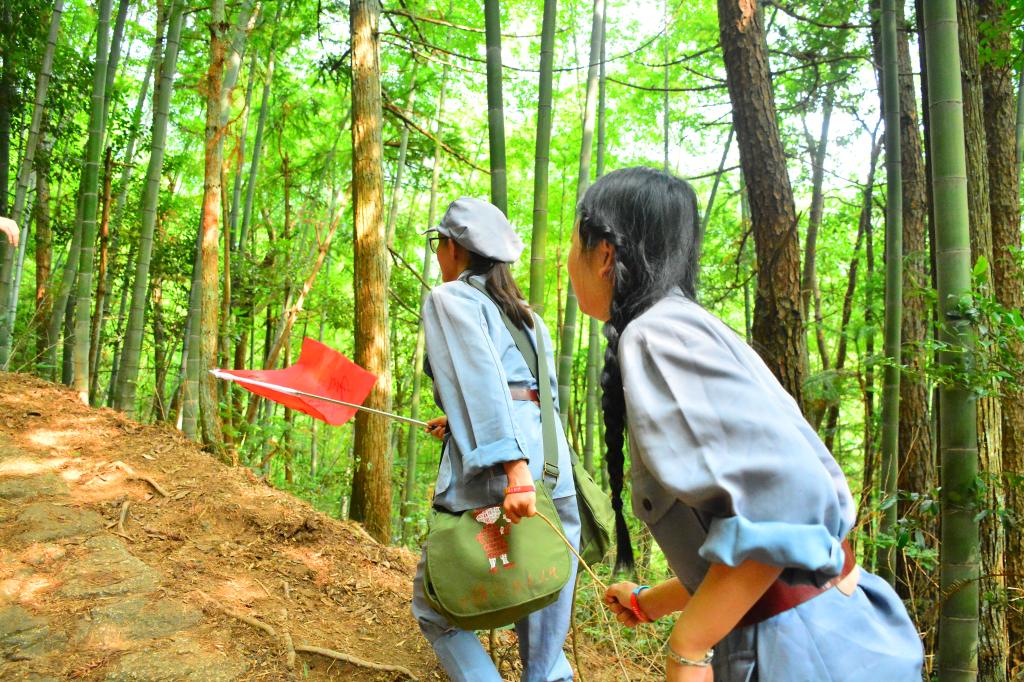 路为羊肠小道,崎岖不平。“小苹果”团队的队员还未走出一百米,已经气喘吁吁、汗流浃背。胡志千是这支队伍的重量与体力担当,平常为队员提包拎重物皆不在话下,无不引队员骄傲。在朱毛红军挑粮小道上,他自己这样说到:“这平常的优势怎么就变成弱势了?我还就不信这个邪了。想当年,朱毛带领红军战士在战争期间穿梭于山上山下,还挑着那么重的粮,都没有叫苦叫累,四处抱怨。何况今天体验的路程只有3100米,我一身轻松还有啥可怕的。”豆大的汗珠很快从他的脸颊上流下,身上的红军服装早已湿透。 “为学犹掘井,井愈深土愈难出,若不快心到底,岂得见泉源乎?”吉大“小苹果”实践团队始终秉持着“不抛弃、不放弃”的优良传统,相互搀扶,有说有笑,欢声阵阵。为给自己和队友“打气”,胡志千还起头带动队员在休息之余唱起红歌,嘹亮歌声响彻山涧。最终,吉大“小苹果”青媒中心社会实践团成功走完朱毛挑粮小道。