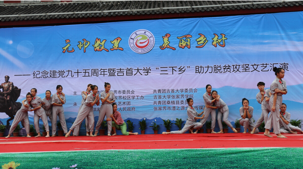 华声在线讯( 通讯员 张欣 肖远东 朱晓露 唐平)6月26日,张家界市桑植县洪家关白族乡游客服务中心人头攒动,歌声荡漾。金年会jinnianhuicom艺术团在这里隆重进行了“元帅故里•美丽乡村——庆祝建党九十五周年暨金年会jinnianhuicom三下乡助力脱贫攻坚文艺汇演”。